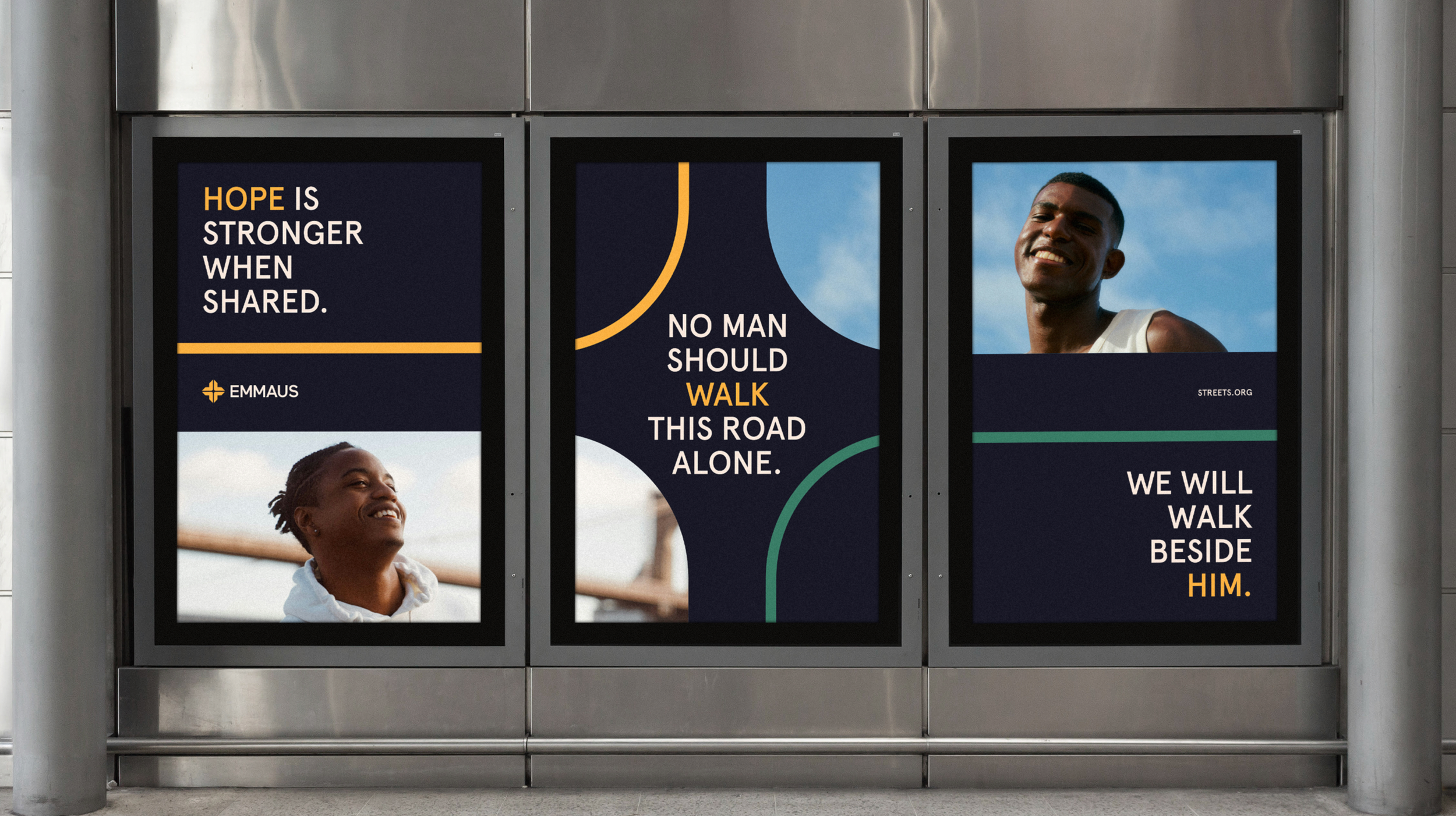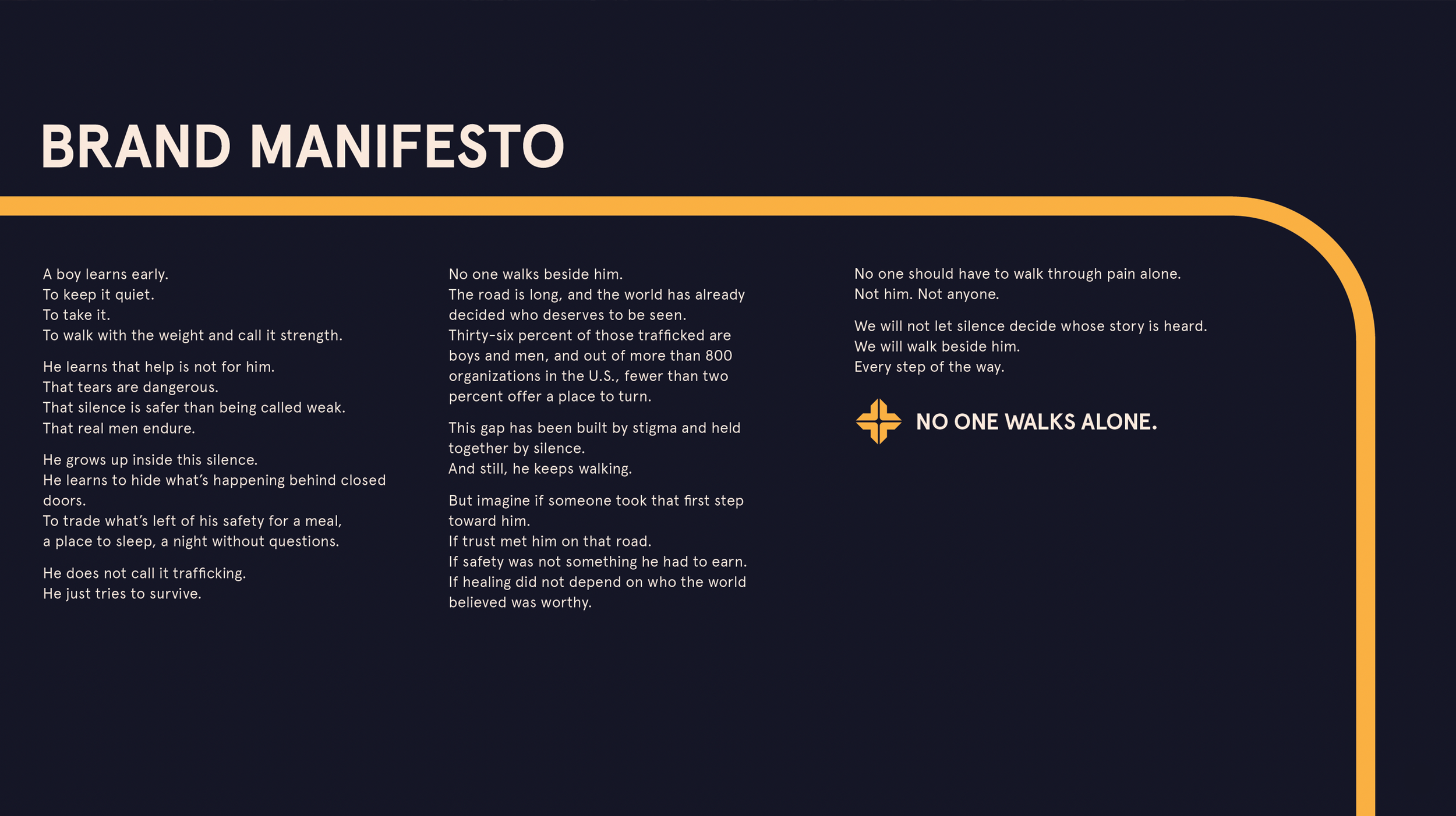 If isolation defines the experience of many survivors, how might the brand consistently communicate companionship, dignity, and presence? These questions ultimately informed the development of the brand’s core message, “No one walks alone.” Using this as the foundation, we built an identity that centres around dignity, community, and what becomes possible when someone finally walks beside them.